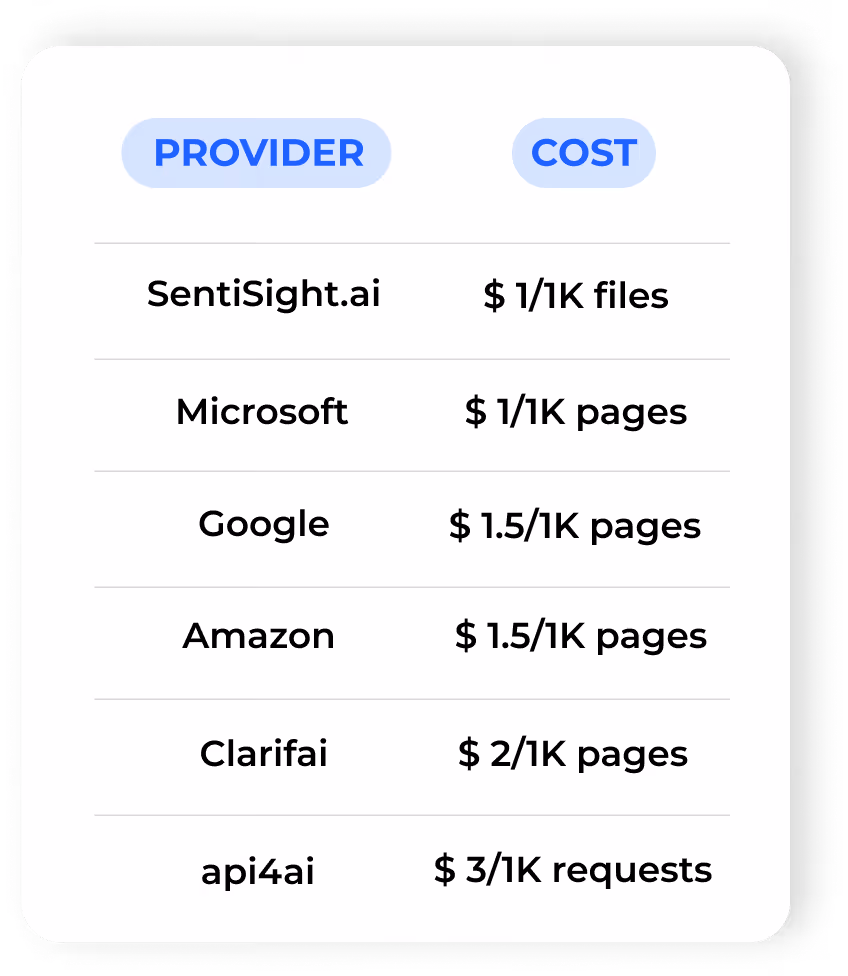 Eden AI offers a user-friendly platform for evaluating pricing information from diverse API providers and monitoring price changes over time. As a result, keeping up-to-date with the latest pricing is crucial. The pricing chart below outlines the rates for smaller quantities for October 2023, as well as you can get discounts for potentially large volumes.
