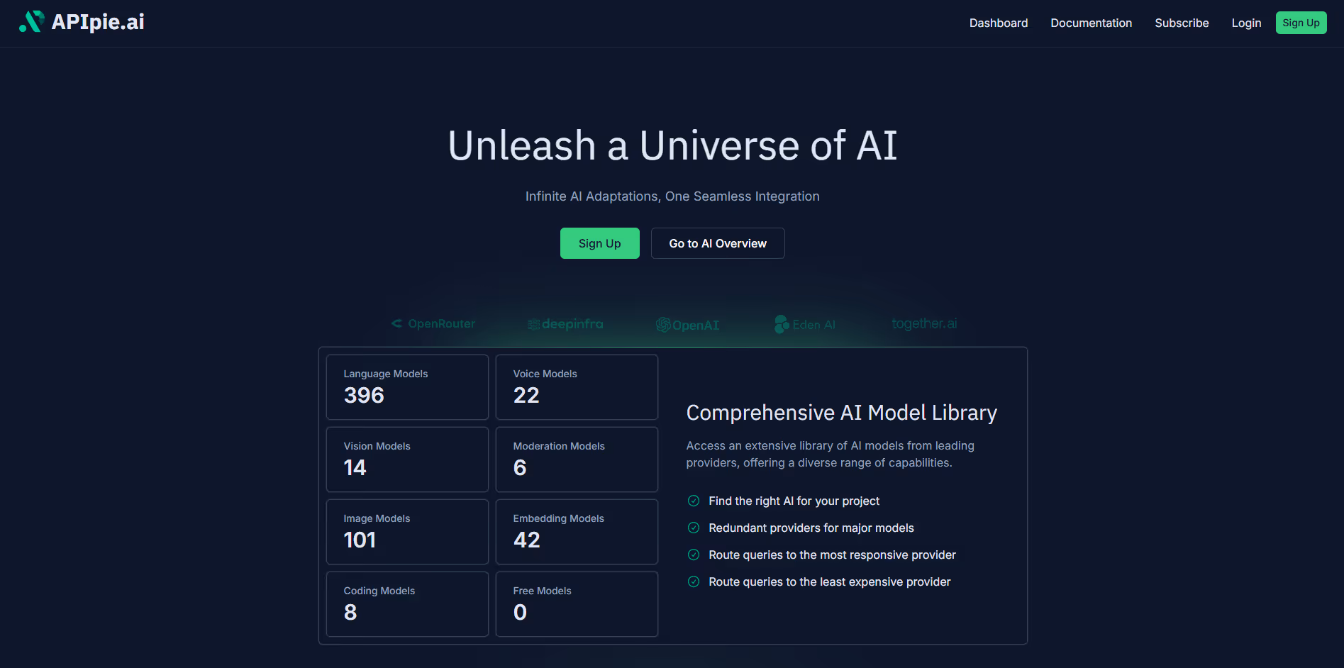 Accédez à un large éventail de fournisseurs d'IA via une seule API, éliminant ainsi le besoin de multiples intégrations.