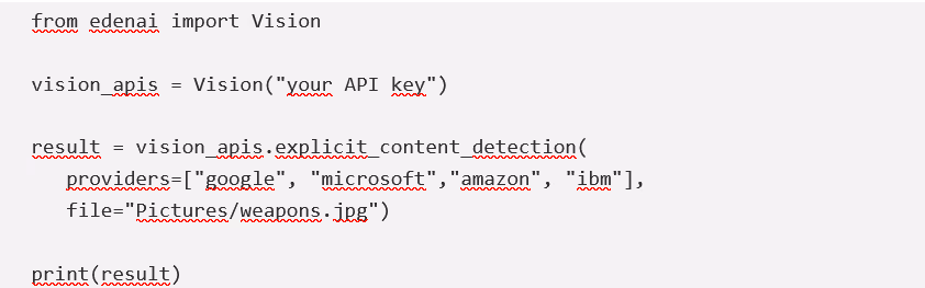 Eden AI fournit la même API facile à utiliser avec la même documentation pour chaque technologie. Vous pouvez utiliser l'API Eden AI pour appeler des moteurs de détection de contenu explicite avec un fournisseur en tant que simple paramètre. Avec seulement quelques lignes, vous pouvez mettre en place votre projet en production.