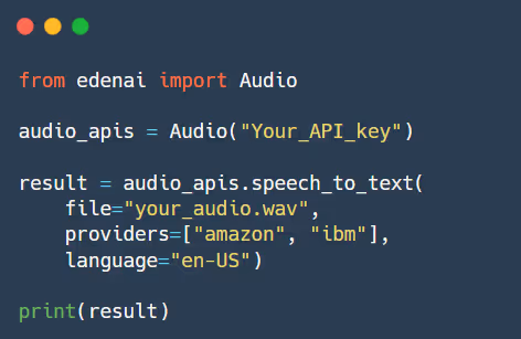 C'est là qu'Eden AI entre en jeu dans votre processus. L'API Speech-to-Text d'Eden AI vous permet d'utiliser les moteurs de tous ces fournisseurs avec une API unique, un jeton unique et une documentation Python simple.