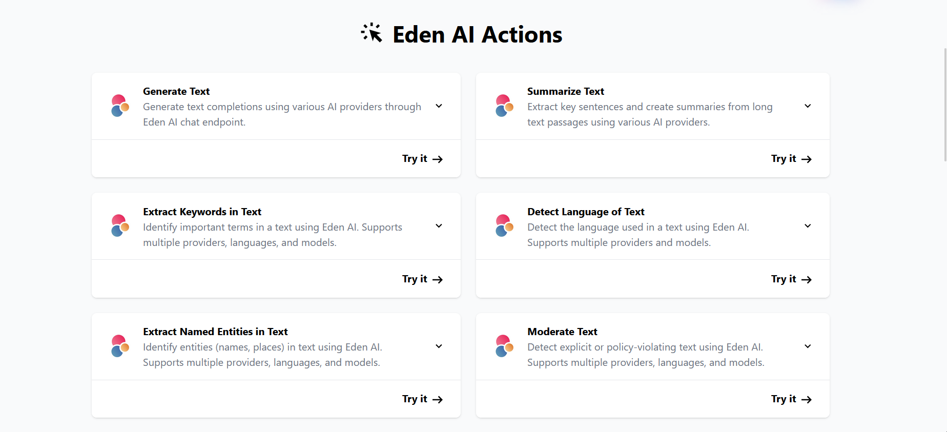 Eden AI’s integration with Activepieces provides unmatched flexibility and scalability. You gain access to multiple AI providers, including OpenAI, Google Cloud, AWS, Microsoft Azure, and AssemblyAI, all through a single API, making it easier to choose the right model for your needs.