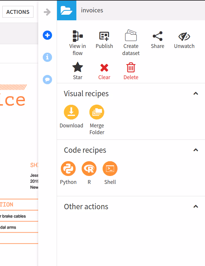 Once your invoices are imported into the folder, you’ll need to create a new recipe by clicking on the action button. Then, select the new code recipe: