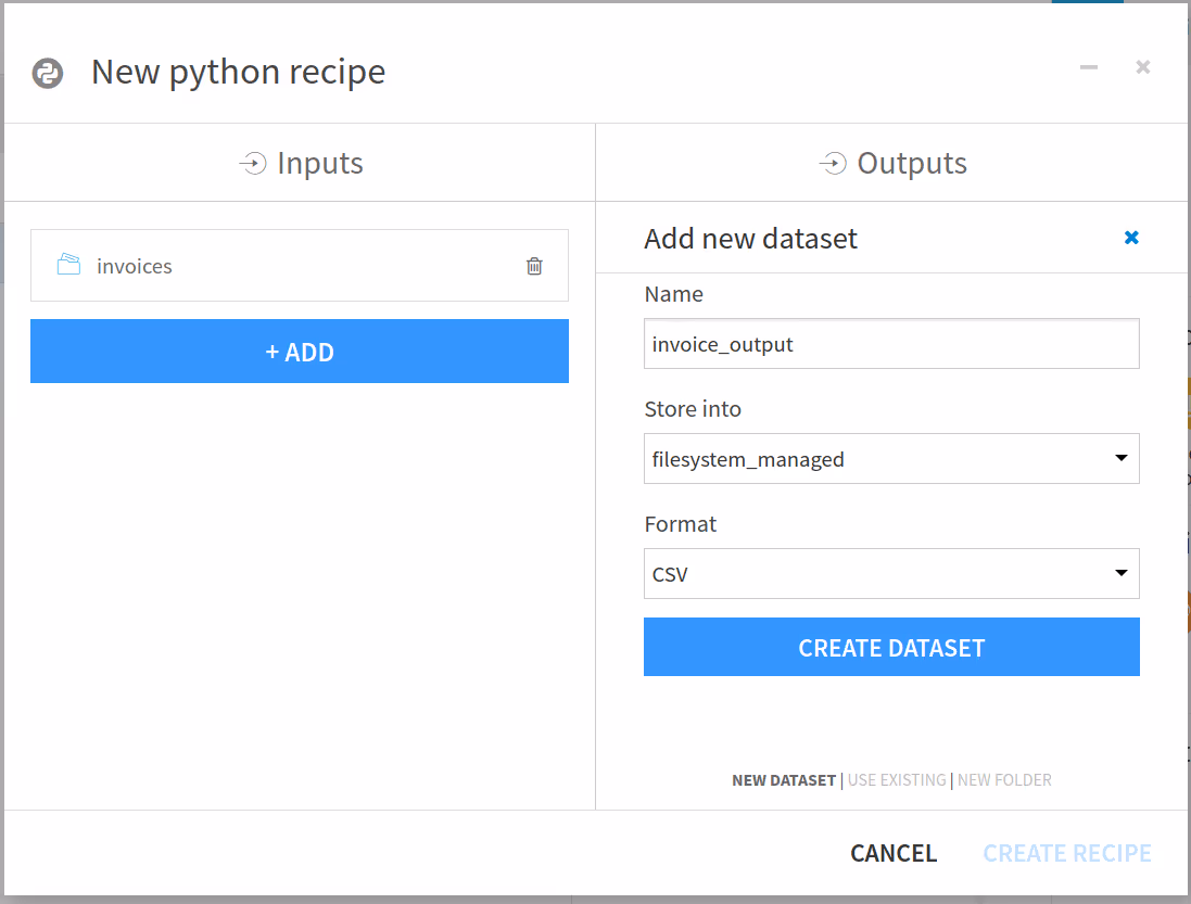 You can choose the type of recipe you want to create, such as Python or Shell. You will also need to create a dataset output for the recipe and give it a name: