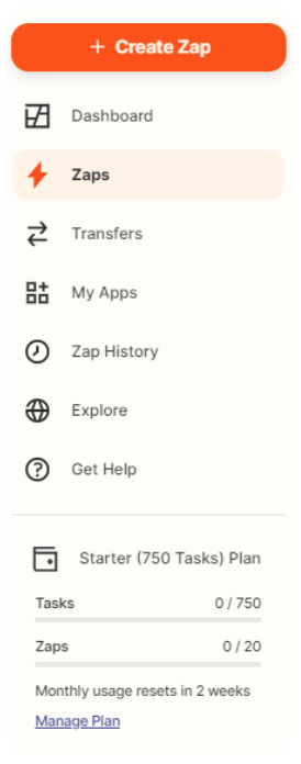 Go to the “Zaps” menu, then create a new Zap.