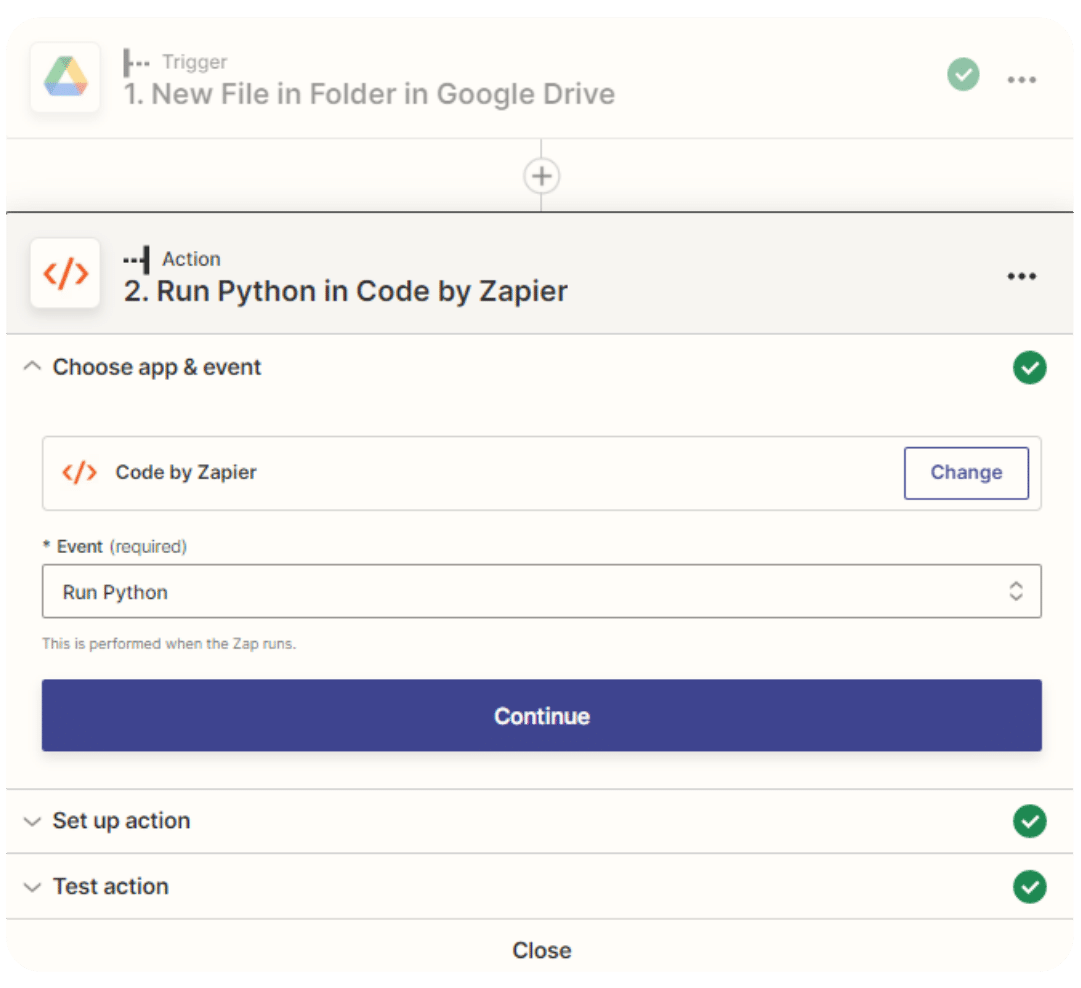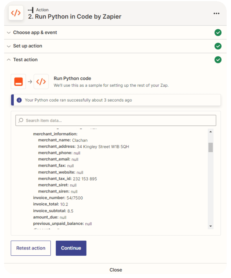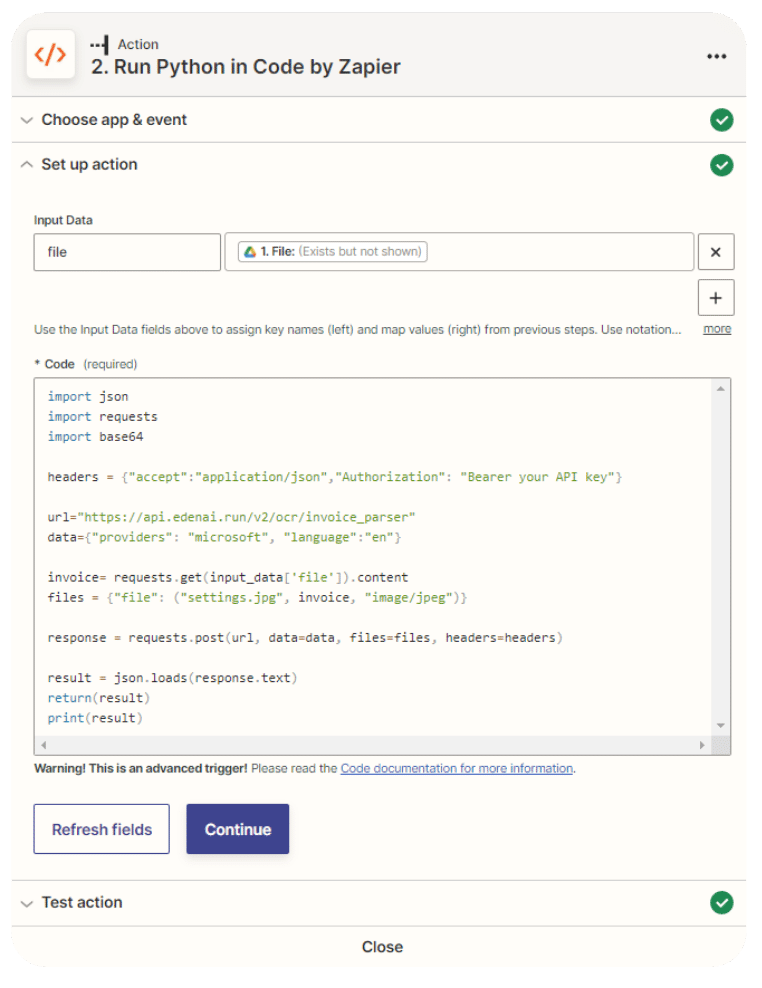 You can now add a new step that will perform an Action: run a Python code in order to call Invoice Parser API. Add a new Code by Zapier step as such and choose Run Python: