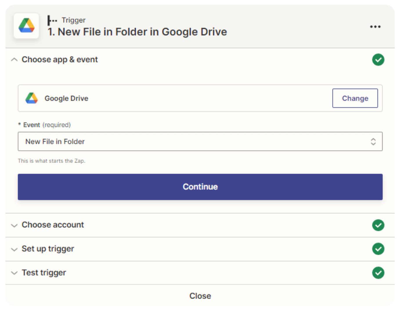 Let's create our first step by choosing a “Trigger”. A trigger in Zapier is an event that starts a workflow or a series of automated actions. In other words, it is the initial event that sets the "zap" in motion. Triggers can be initiated by various events, such as the creation of a new item in a spreadsheet, the receipt of an email, or the submission of a form.