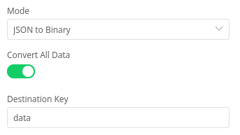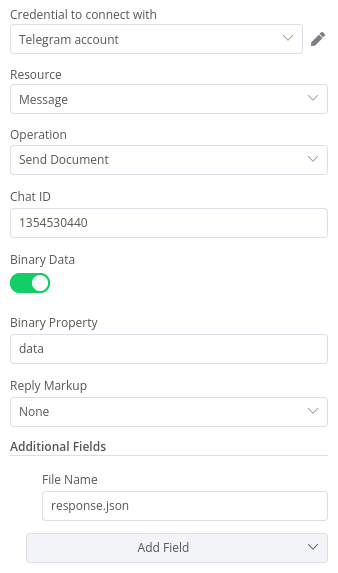 Now, you just need to take the JSON data and send it via Telegram. But a file needs to be in binary, not in JSON format. So we use a new node "Move binary data" and configure it to move from JSON to binary.