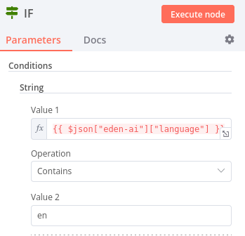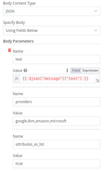 This will help us in the next step as we want to know if English is part of the list of languages detected. You can see that in the “text” field, you have a dynamic Value. When you want to use specific data from a previous node that is not binary, you can use an Expressions instead of a Fixed Value.