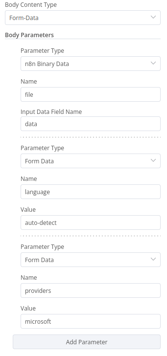 Use “n8n binary data” to select the file from the previous node and use it as a parameter.
