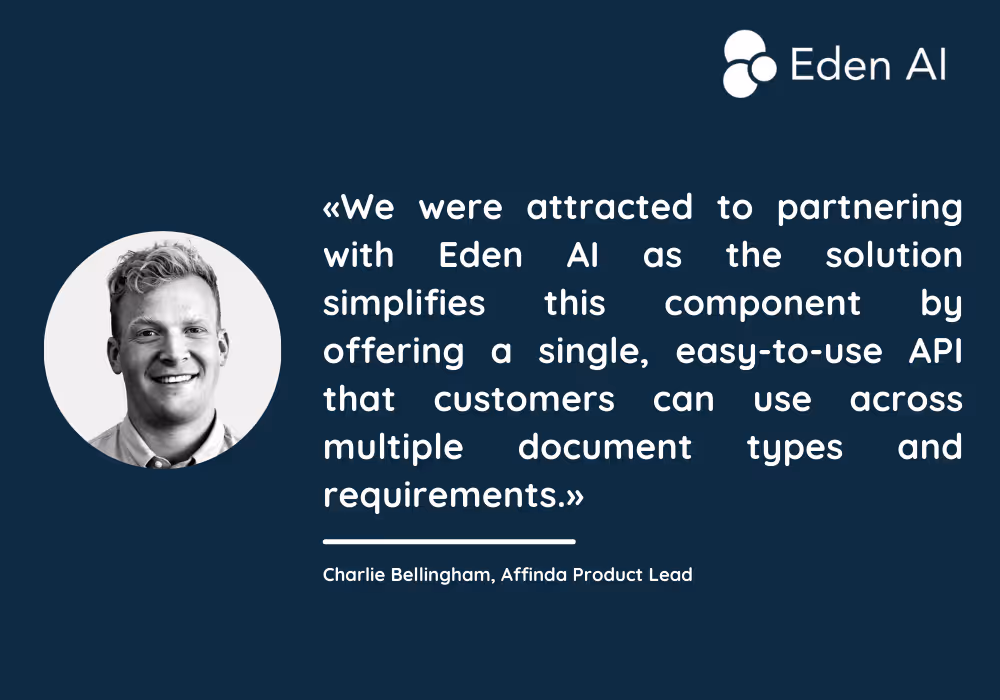 A very common pain point for customers is the integration of solutions like ours into their platforms. We were attracted to partnering with Eden AI as the solution simplifies this component by offering a single, easy-to-use API that customers can use across multiple document types and requirements. It means that Affinda document extraction products can be offered alongside solutions from other industry leaders. This allows customers to improve a wide range of business processes and drive efficiency through the latest advancements in AI technology.