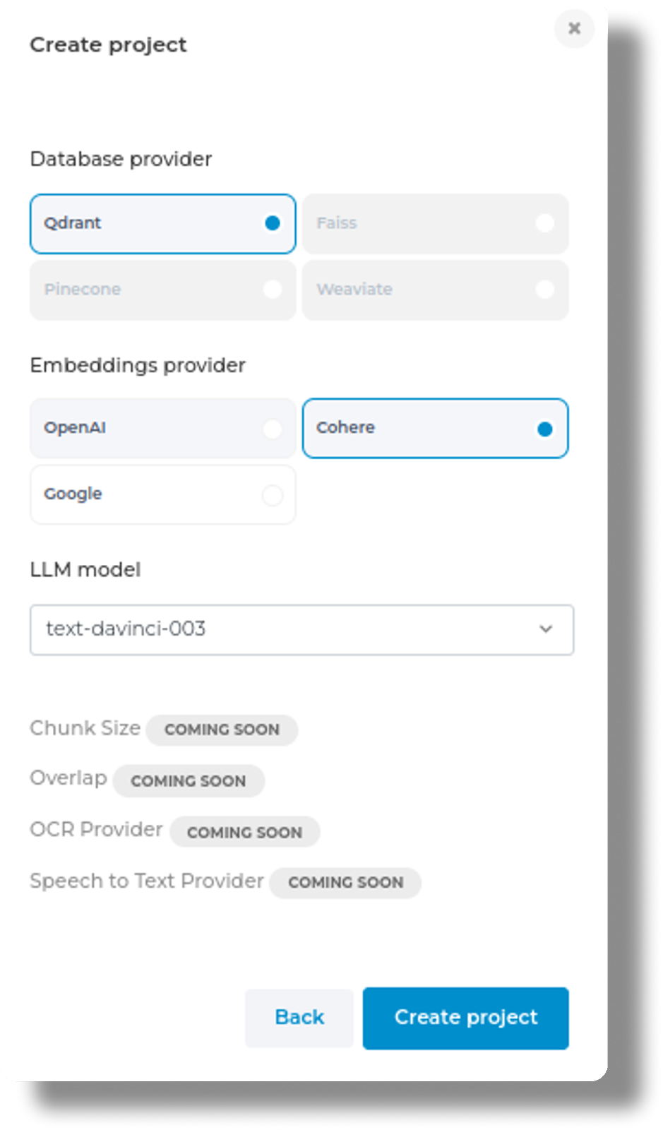 In the start from scratch option, you have the flexibility to select your current database provider, presently qdrant. Additionally, you can choose your embedding provider from a selection that includes Open AI, Google, and Cohere and your LLM model.