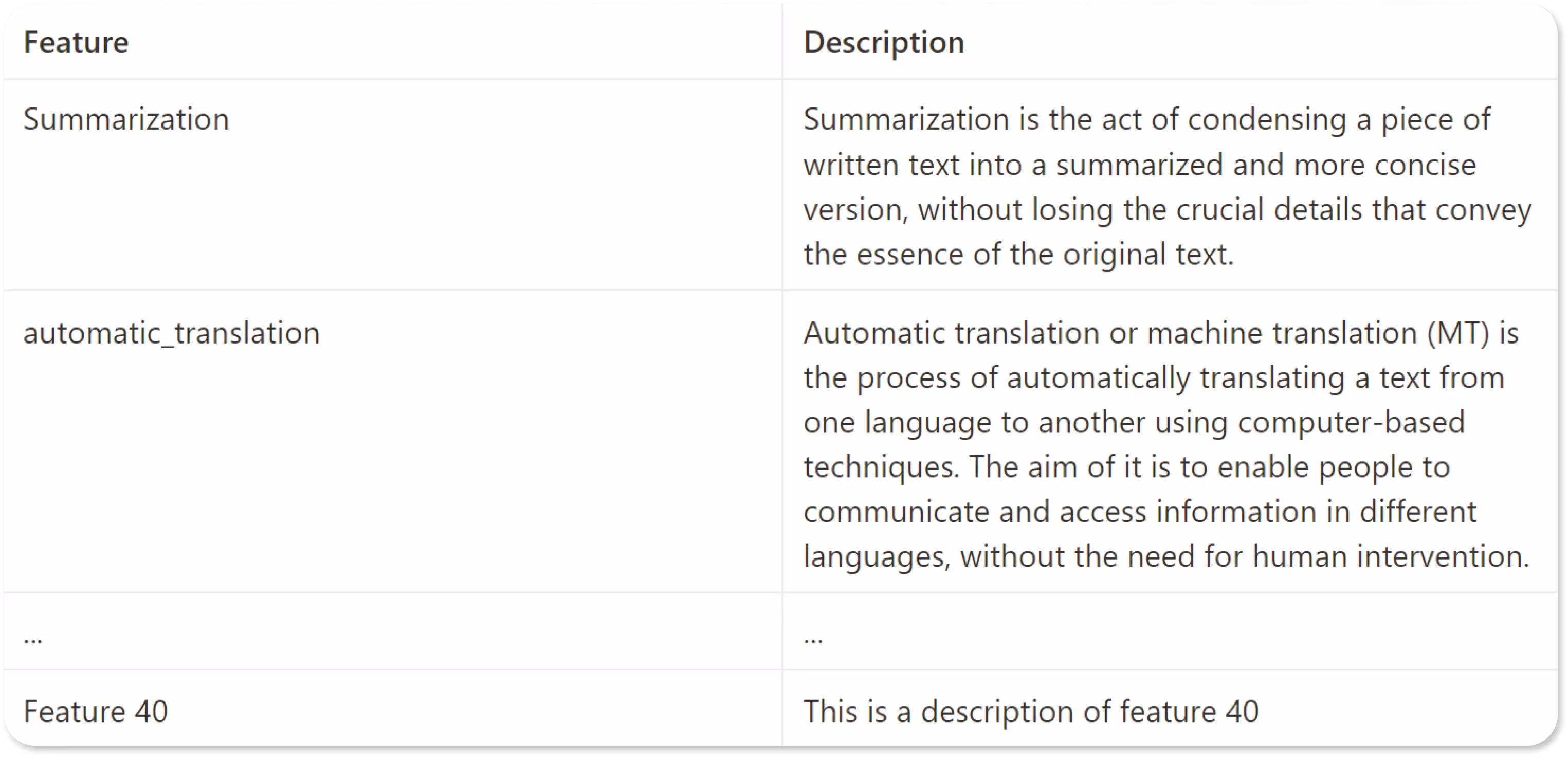 First, prepare your dataset. For the purpose of this tutorial, we'll use a dataset of 40 AI features, where each feature is described by a short text description. The dataset can be in any format, but for simplicity, we'll use a CSV file. Here's a sample of what the dataset might look like: