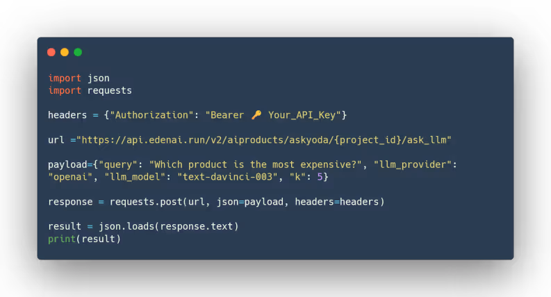 With Eden AI's AI Chatbot solution with RAG, you can easily build a customized AI assistant that meets your unique database needs. You can train your chatbot on your own data or on your business using various programming languages such as Python, JavaScript and more.