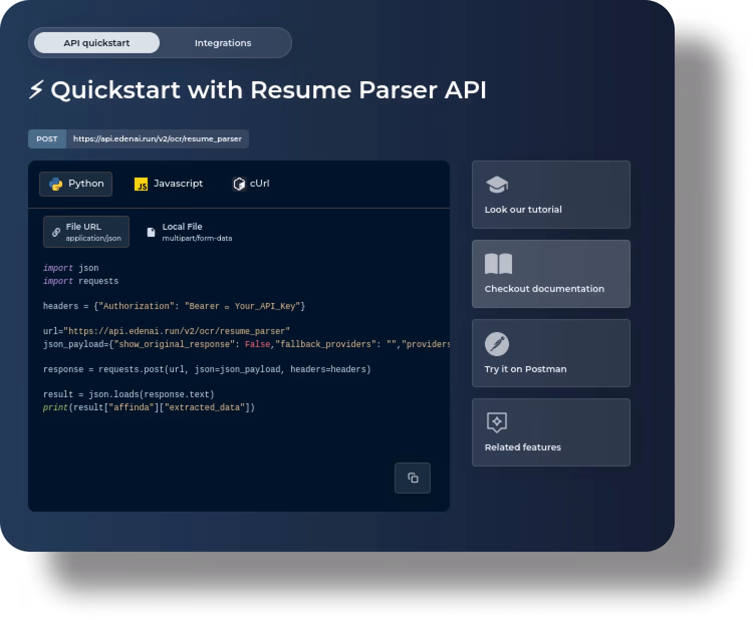 With your chosen Resume Parser provider, integrate it into your app using our API documentation and guidelines. Eden AI API offers comprehensive documentation and code snippets, enabling smooth integration with your preferred programming language.