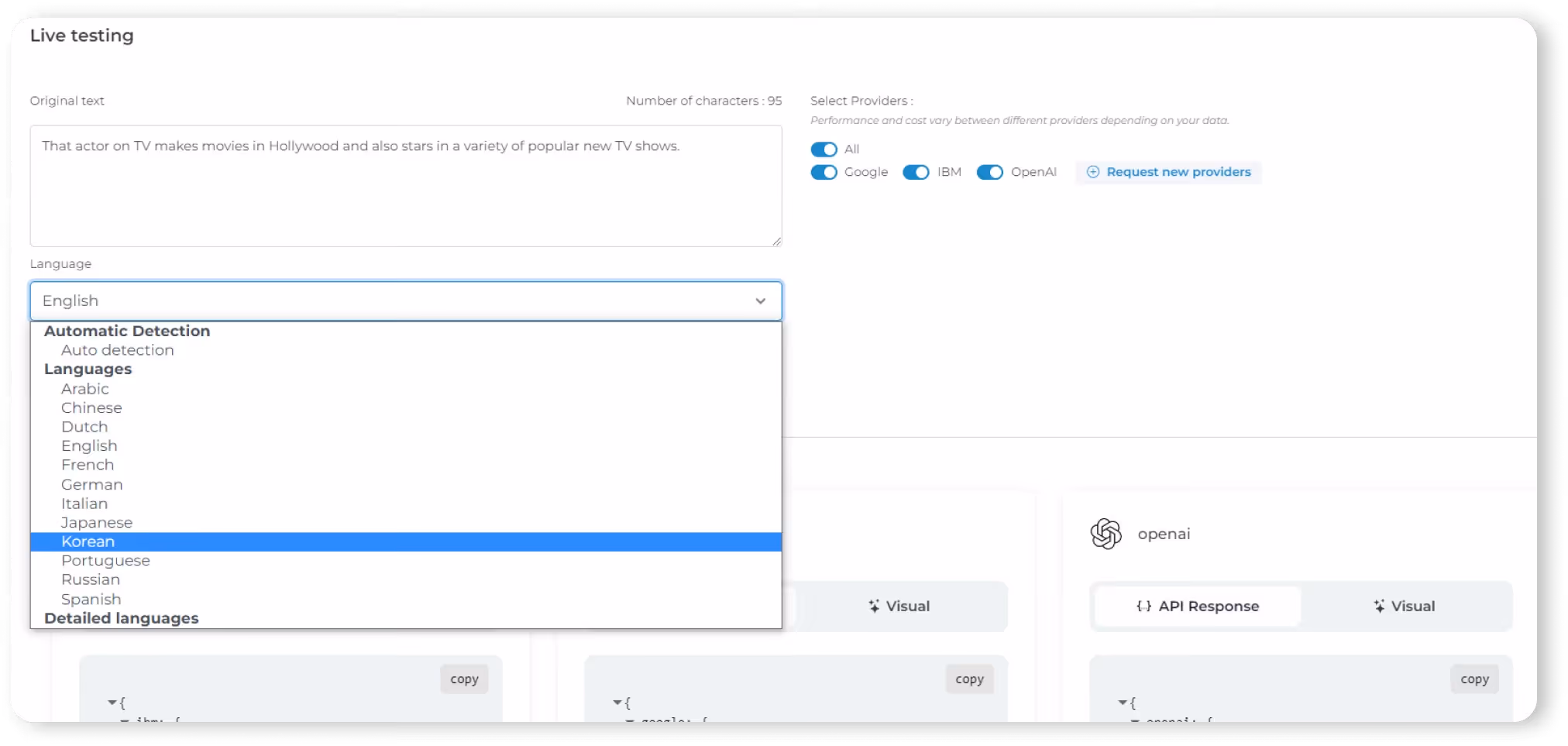 Utilize Eden AI's user-friendly interface to upload your text. You can then compare the different responses you get from the different providers: