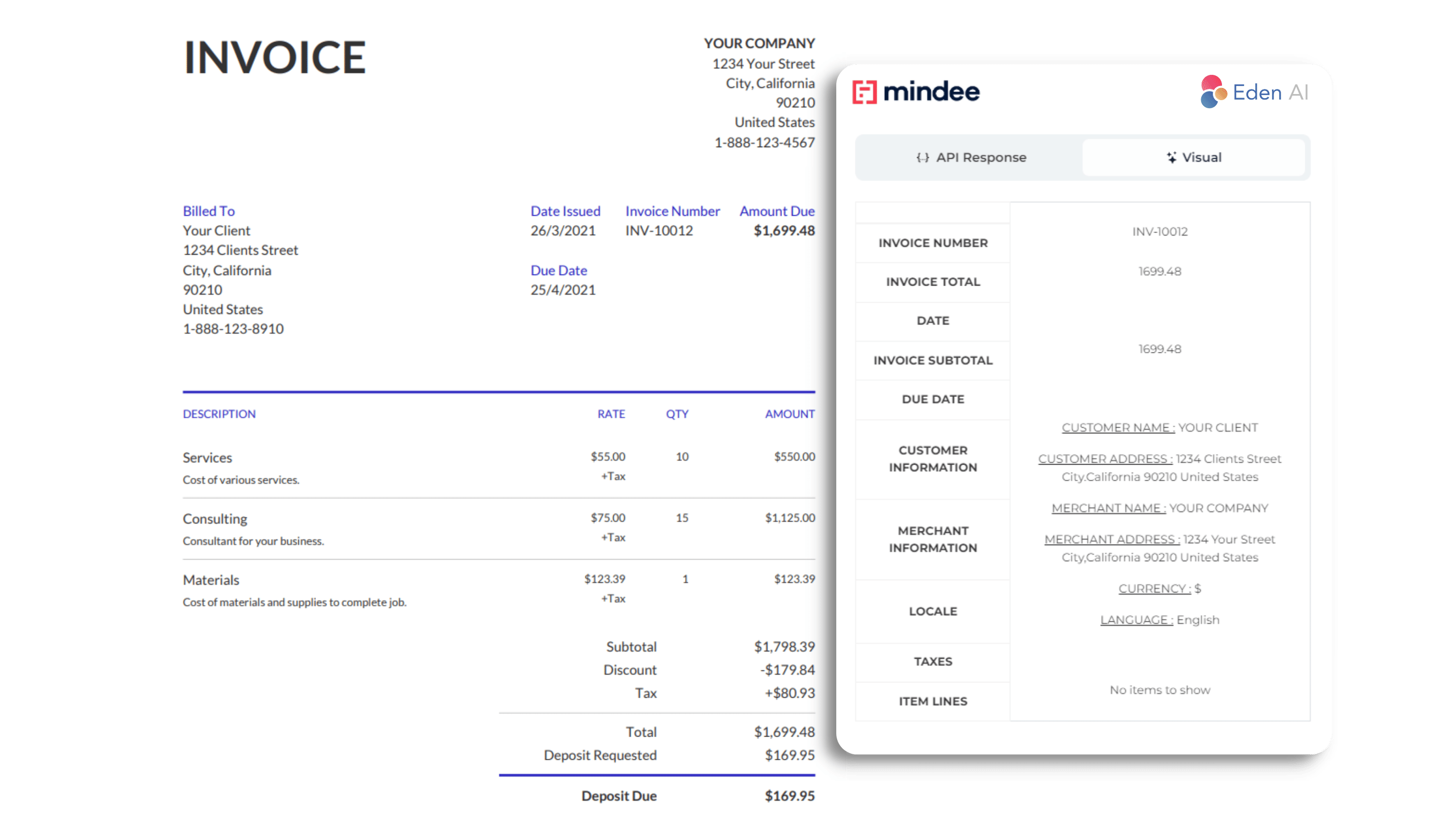 For each invoice parsed in the module, different fields will be extracted such as: invoice number, taxes, amounts, dates, customer and merchant information, line items, etc.