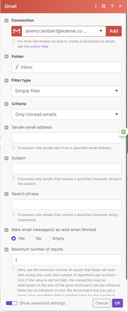 Let’s take Gmail for instance: you'll need to connect your Gmail account on the Watch Email module. Next, select the folder you want to be watched. Then, set up your criterias which can be: