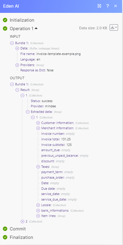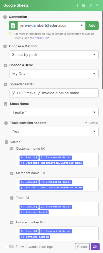 The structure of the answer is always the same, regardless of the supplier you choose or the invoice you analyse. That way, your scenario remains functional and you can take the information wherever you want (your ERP, Airtable, Google sheet, etc.).