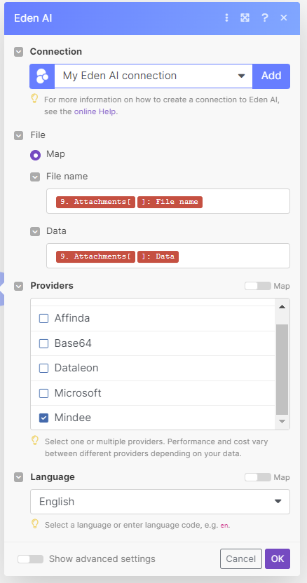Once the connection is set, the configuration of the Eden AI Invoice module is very easy. First, you will need to plug the file from Gmail module, then choose the invoice engine you want to use along with the language of your invoice: