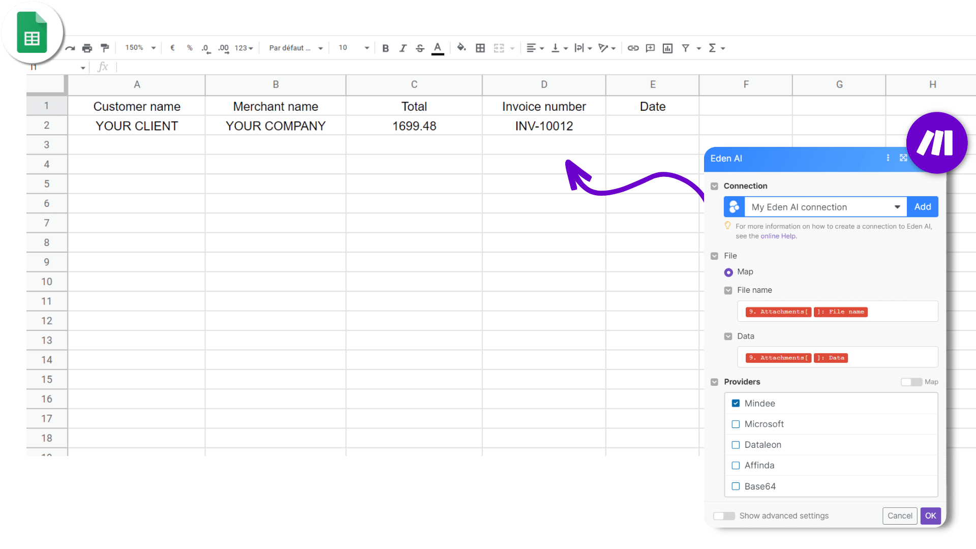 Then, you can automatically add the extracted data in your spreadsheet: