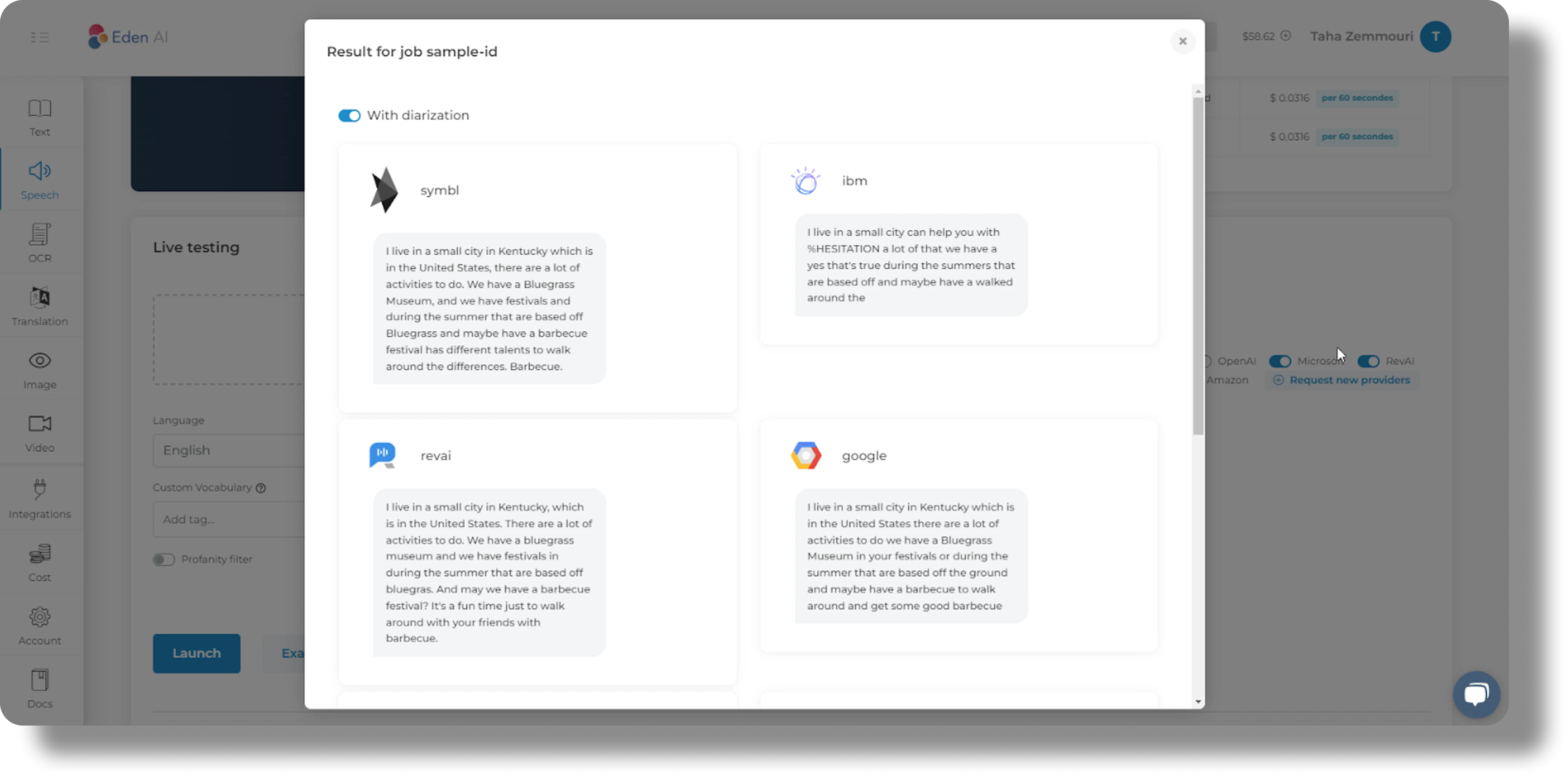 Sit back and relax as Eden AI efficiently transcribes your audio into accurate text. You can compare the different responses you get from the different providers: