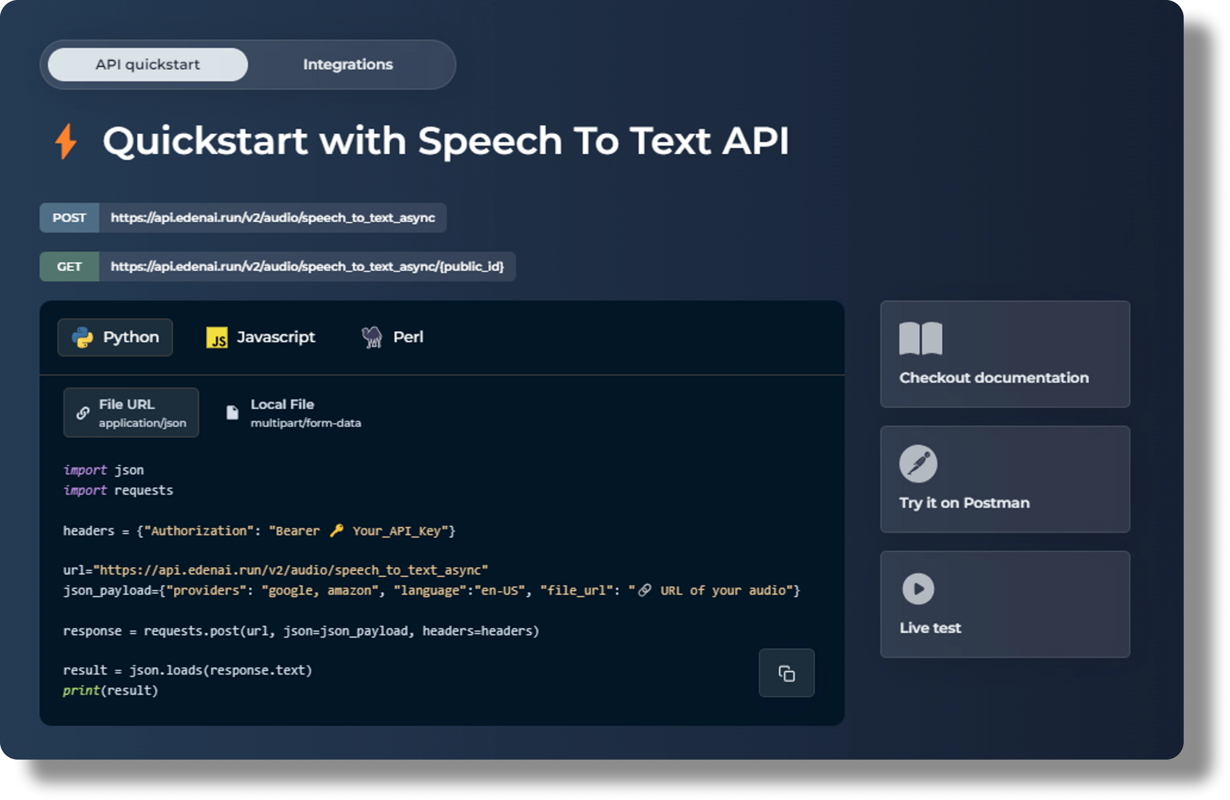 With your chosen Speech-to-Text provider, integrate it into your application using the provided API documentation and guidelines. Eden AI API offers comprehensive documentation and code snippets, enabling smooth integration with your preferred programming language.