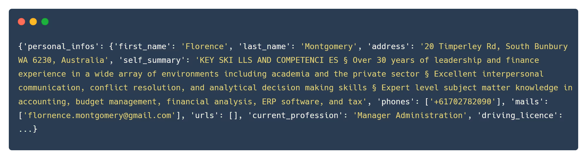 Here is an example of a Resume Parsing response: