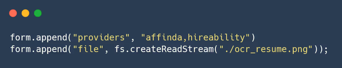 Now that you have initialized the required JavaScript modules and got your API key, you will be able to extract information from your resumes. With Eden AI, you can choose from a wide range of engines you want to use Resume Parsing. You can access Resume Parsing providers on our documentation here.