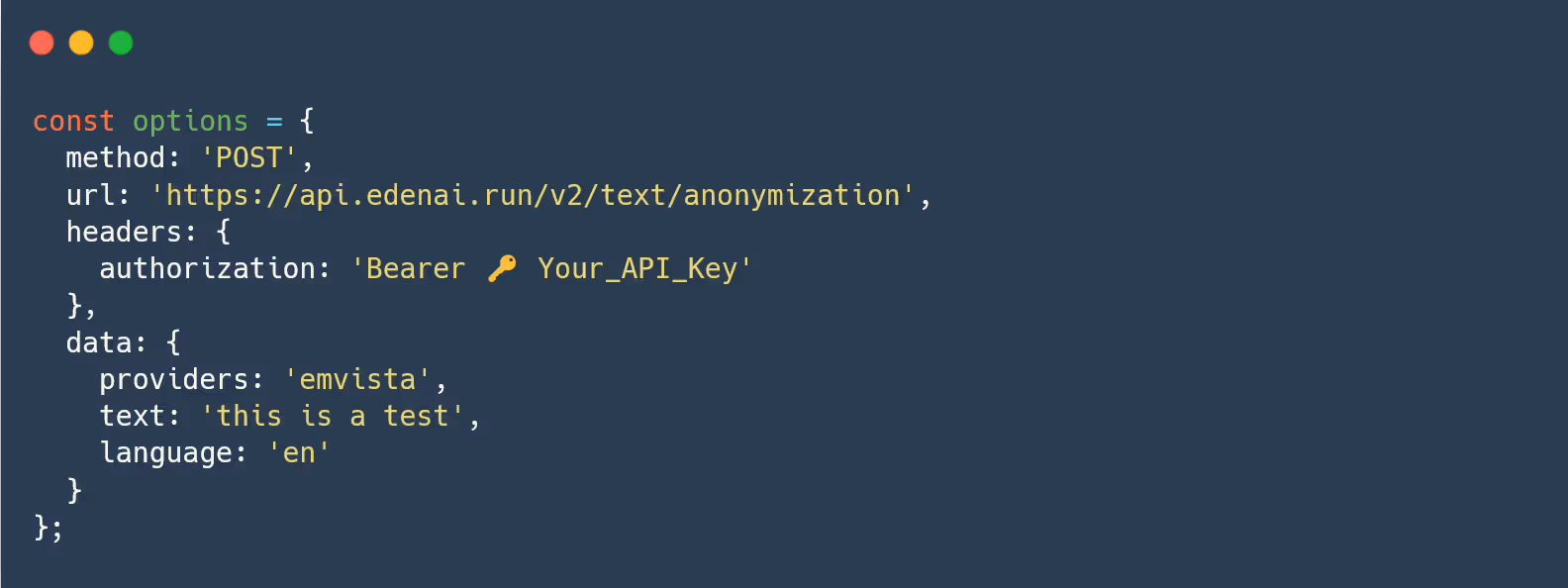 In this tutorial, you will learn how to use Text Anonymization API in 5 minutes using JavaScript. Eden AI provides an easy and developer-friendly API that allows you to anonymize your texts.