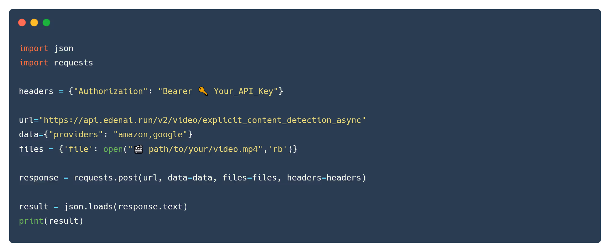 Now that you have imported packages on Python and got your API key, you will be able to detect explicit contents in videos. With Eden AI, you can choose from a wide range of engines you want for Explicit Content Detection. You can access the list of Explicit Content Detection providers available on Eden AI directly on our documentation.