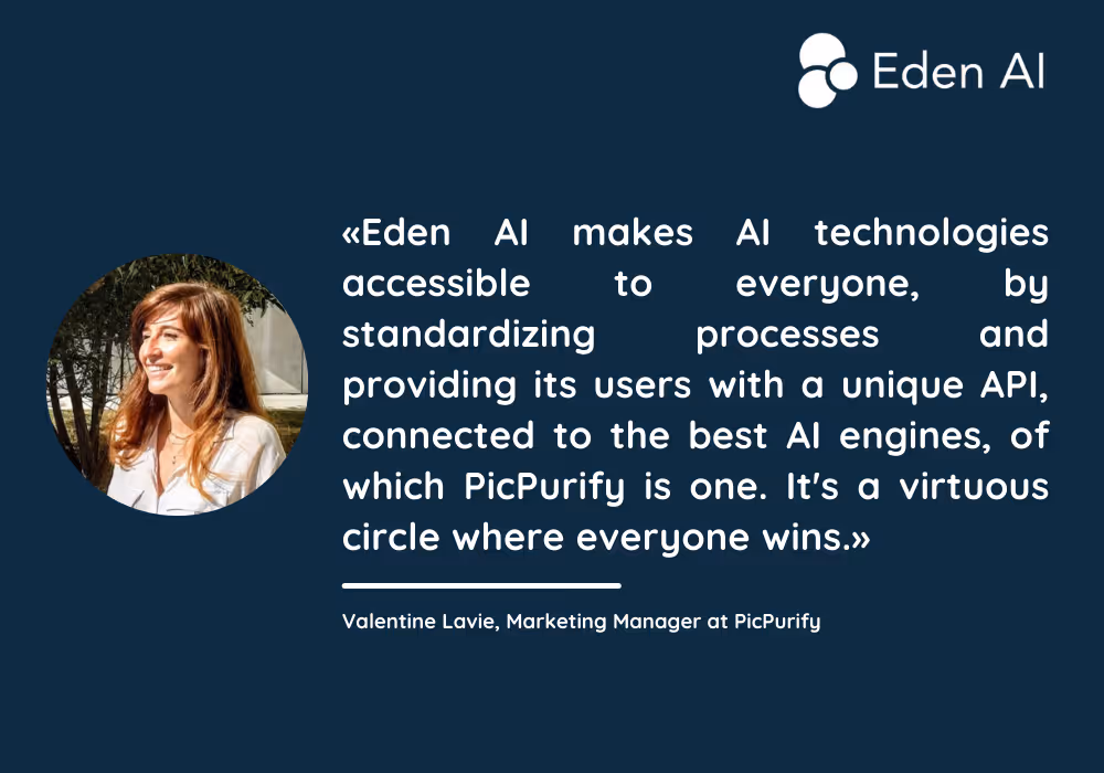 Eden AI is also a French startup at the cutting edge of technology, so the synergy between our two structures was obvious. Eden AI makes AI technologies accessible to everyone, by standardizing processes and providing its users with a unique API, connected to the best AI engines, of which PicPurify is one. It's a virtuous circle where everyone wins.