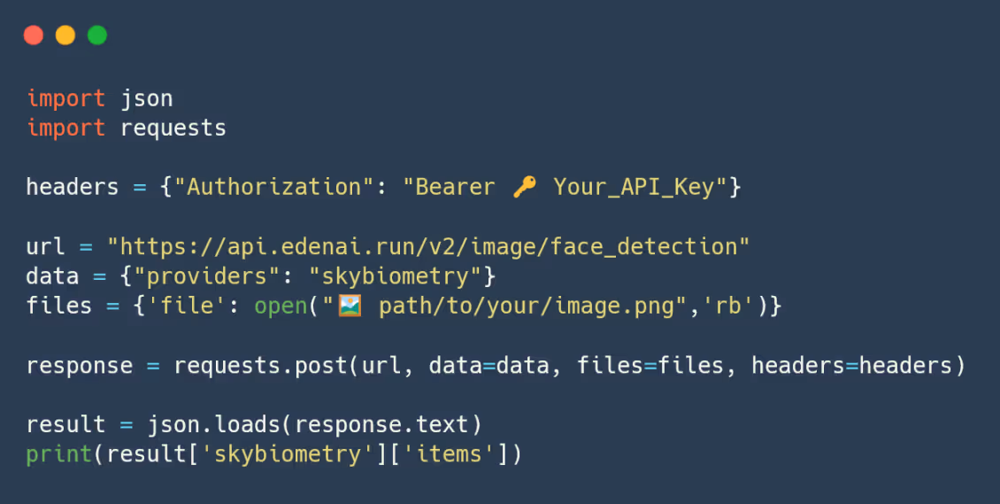You'll need some documentation to use SkyBiometry face detection on Eden AI. Then call the API: