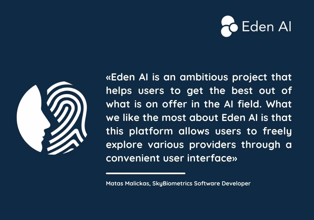 Eden AI offers SkyBiometry AI solutions on its platform amongst several other technologies. We want our users to have access to multiple AI engines and manage them in one place so they can reach high performance, optimize cost and cover all their needs.