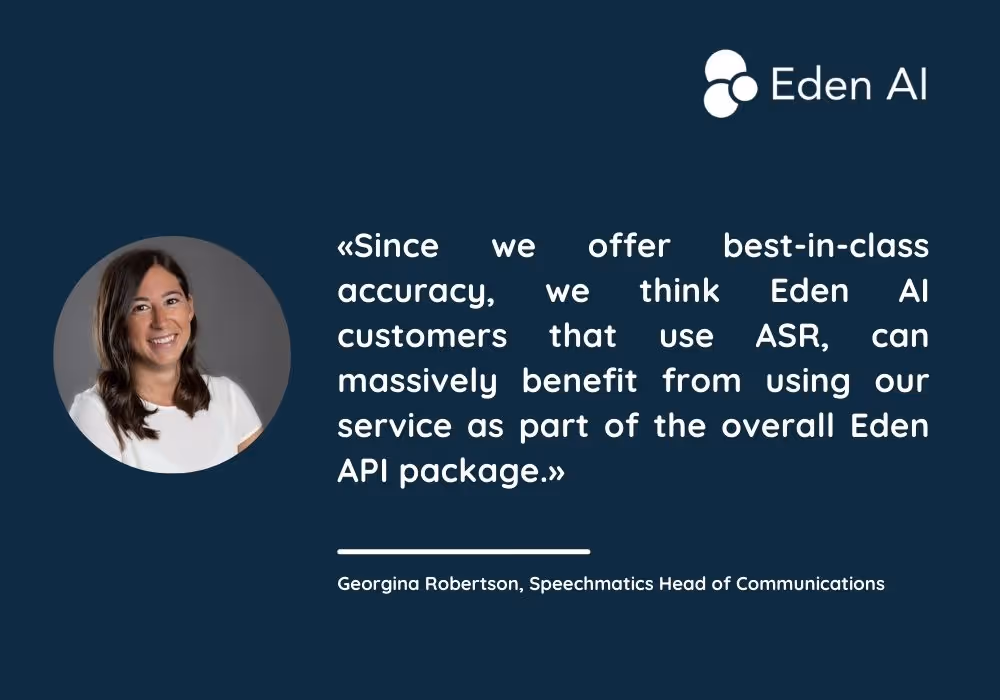 Eden AI offers Speechmatics speech technology on its platform amongst several other technologies. We want our users to have access to multiple AI engines and manage them in one place so they can reach high performance, optimize cost and cover all their needs.
