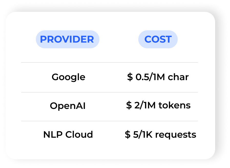 Eden AI offers a user-friendly platform for evaluating pricing information from diverse API providers and monitoring price changes over time. As a result, keeping up-to-date with the latest pricing is crucial. The pricing chart below outlines the rates for smaller quantities for November 2023, as well as you can get discounts for potentially large volumes.