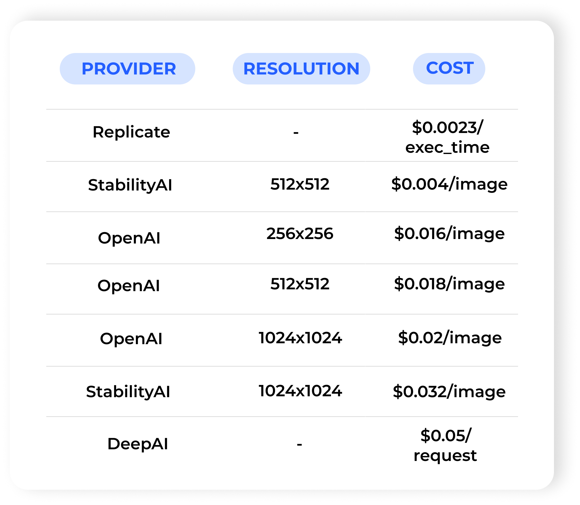 Our standardized API enables you to integrate Text to Image Generation APIs into your system with ease by utilizing various providers on Eden AI. Here is the list (in alphabetical order):