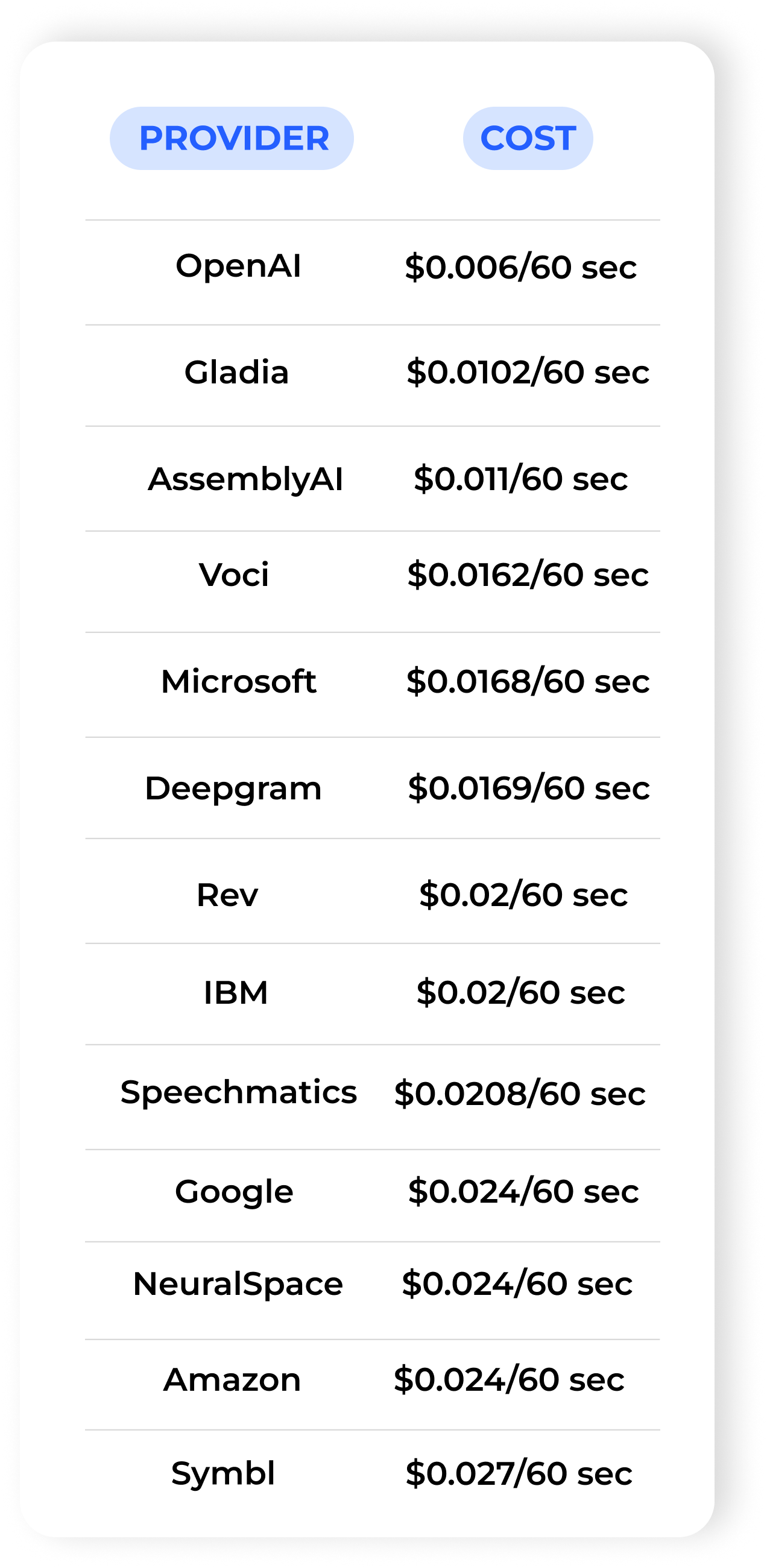 Our standardized API enables you to integrate Speech to Text APIs into your system with ease by utilizing various providers on Eden AI. Here is the list (in alphabetical order):