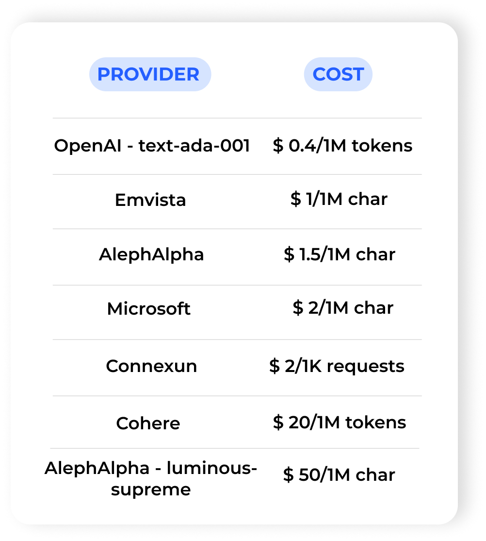 Eden AI offers a user-friendly platform for evaluating pricing information from diverse API providers and monitoring price changes over time. As a result, keeping up-to-date with the latest pricing is crucial. The pricing chart below outlines the rates for smaller quantities for October 2023, as well as you can get discounts for potentially large volumes.