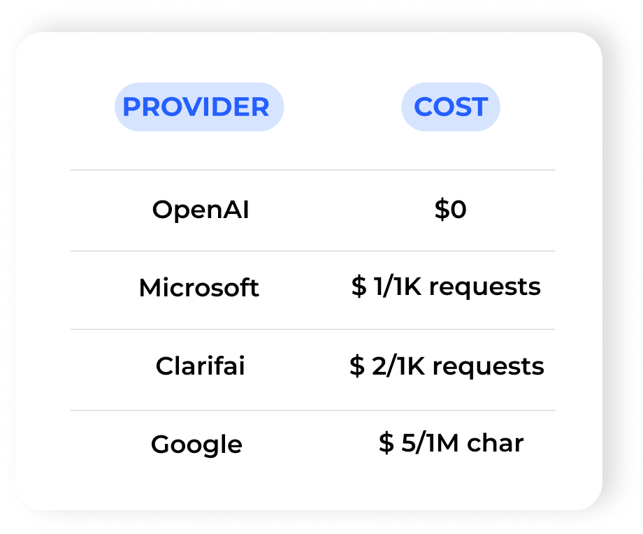 Eden AI offers a user-friendly platform for evaluating pricing information from diverse API providers and monitoring price changes over time. As a result, keeping up-to-date with the latest pricing is crucial. The pricing chart below outlines the rates for smaller quantities for November 2023, as well as you can get discounts for potentially large volumes.