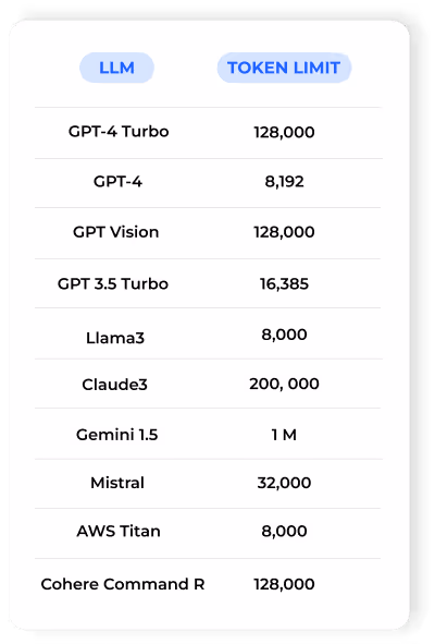 Token limits refer to the maximum number of tokens (words or subwords) that a language model can process in a single input or generate in a single output. Given that these tokens are stored and managed in memory, these restrictions serve to maintain the model's efficiency and streamline resource usage. Below are some examples of Language Model (LLM) constraints.