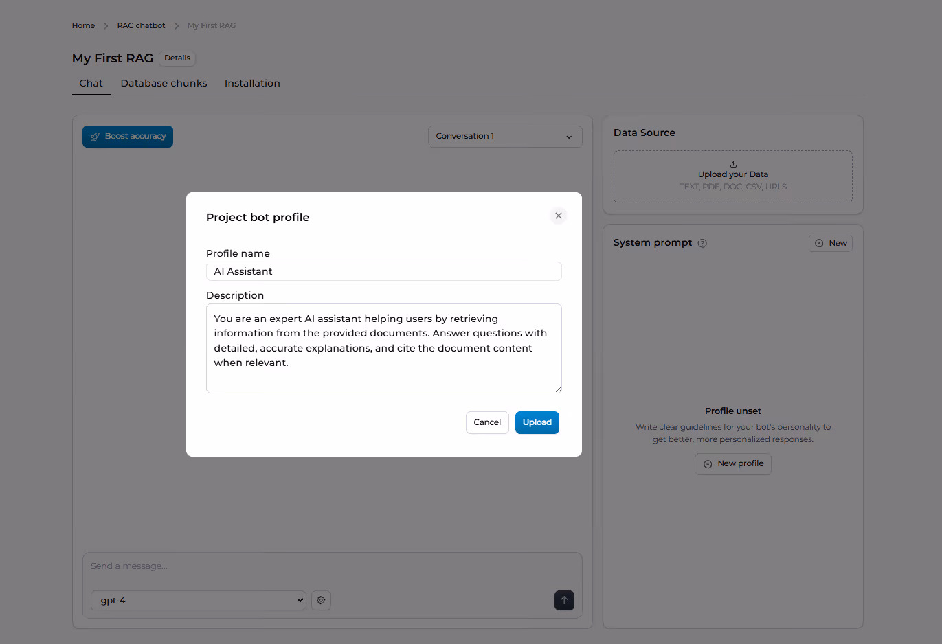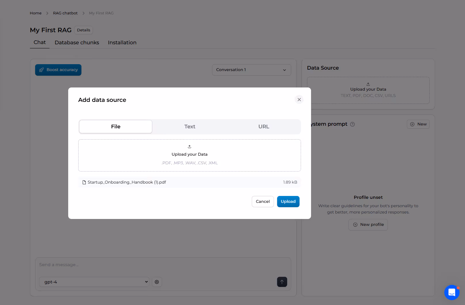 In the project interface, find the Data section where you can upload documents. Simply drag-and-drop your PDF or click to upload. The platform will automatically handle extracting the text from the PDF, chunking it, and creating embeddings for each chunk.