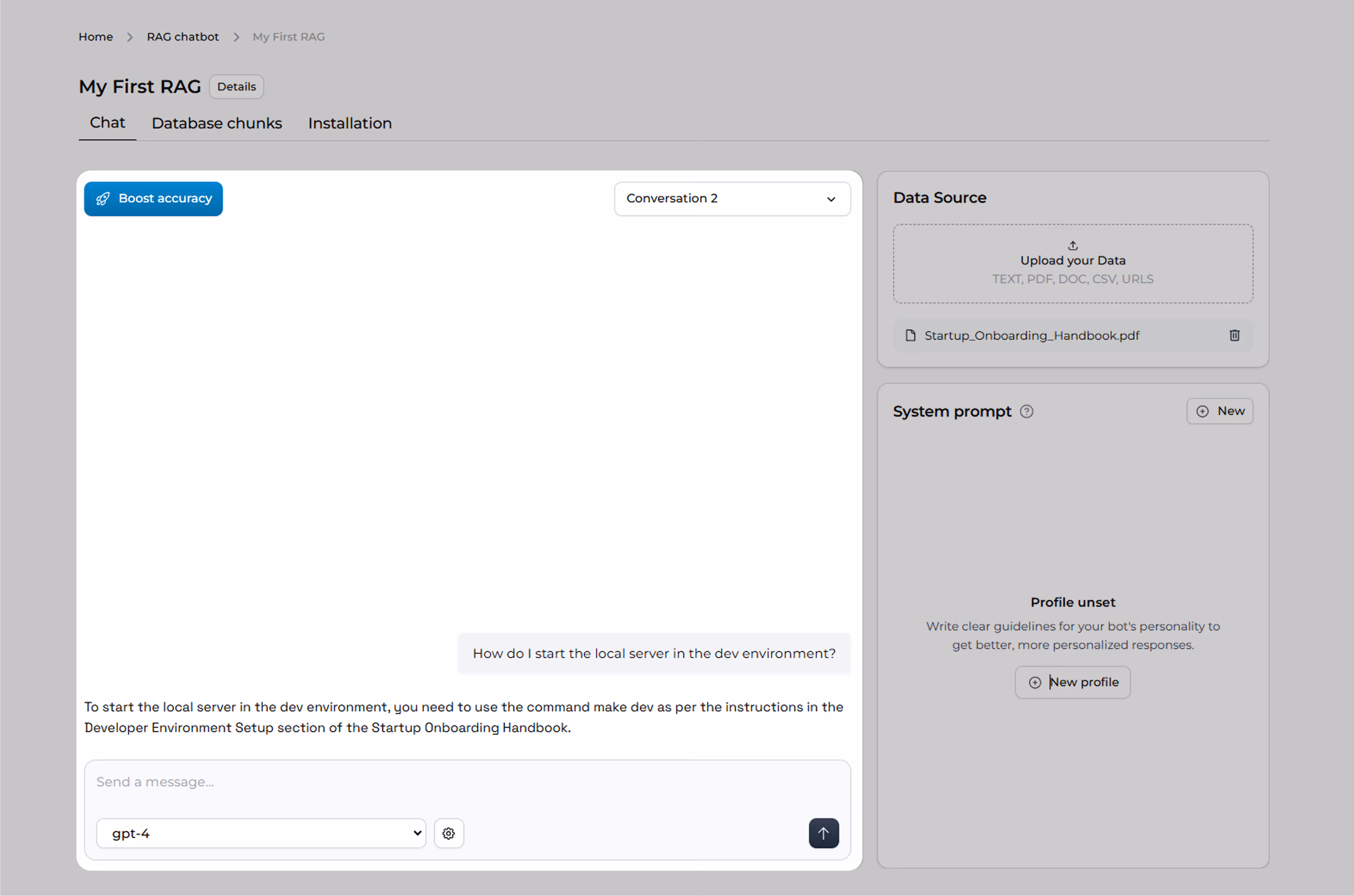 Navigate to the Chat section of your RAG project. You’ll find a live chat interface similar to ChatGPT where you can type a user query and observe the model’s response. Ensure the correct LLM is selected (e.g. GPT-4 as configured in Step 2), and that your onboarding handbook has been fully processed and indexed.