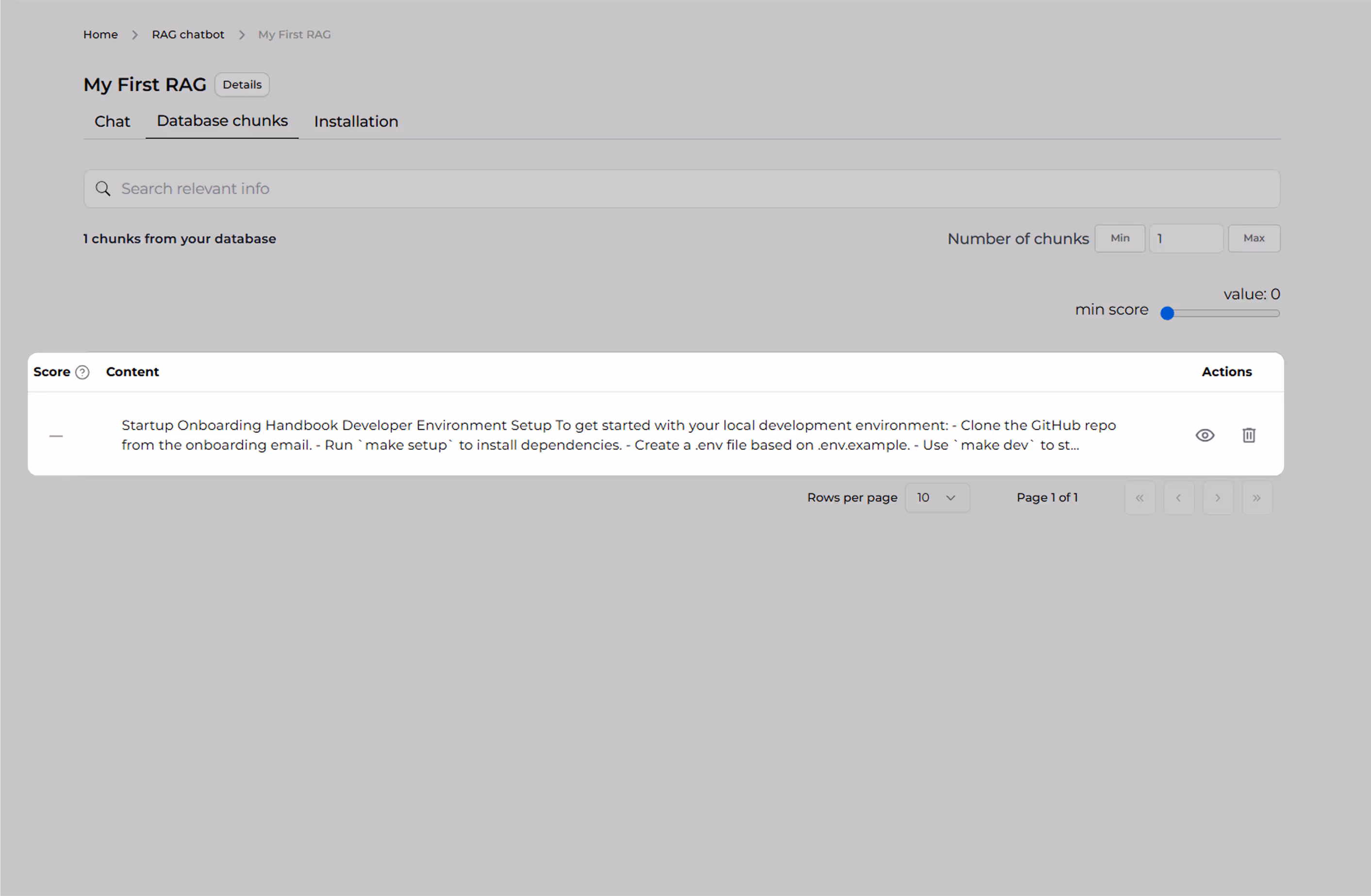 💡 You can verify what data was used to generate the answer by clicking the “Database Chunks” tab. This shows you exactly which parts of the onboarding PDF were retrieved. For example, the assistant may have pulled two chunks: