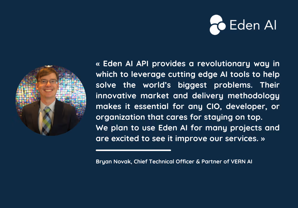 Eden AI API provides a revolutionary way in which to leverage cutting edge AI tools to help solve the world’s biggest problems. Their innovative market and delivery methodology makes it essential for any CIO, developer, or organization that cares for staying on top. We plan to use Eden AI for many projects and are excited to see it improve our services.