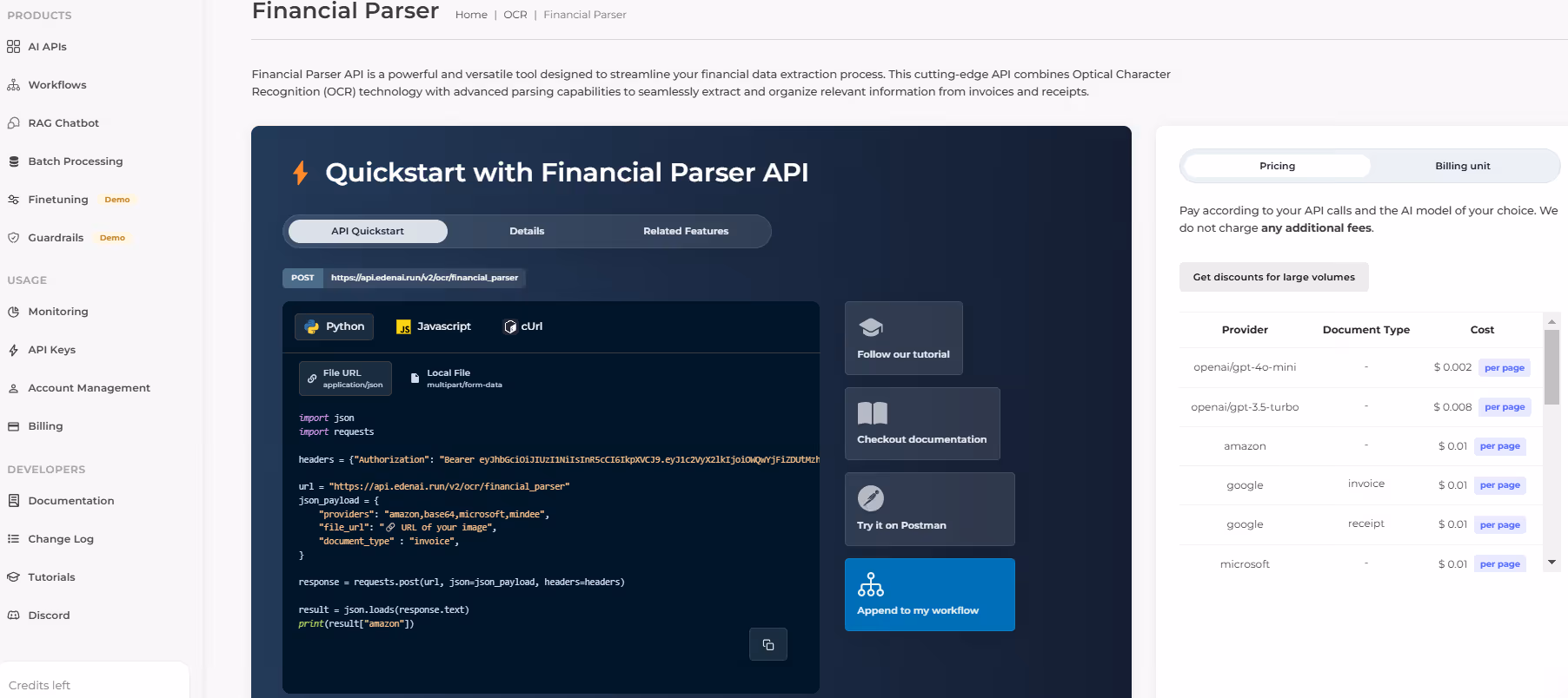 To begin, navigate to the Eden AI platform and locate the Financial Parser API. This API is designed to handle various document formats and extract data efficiently.